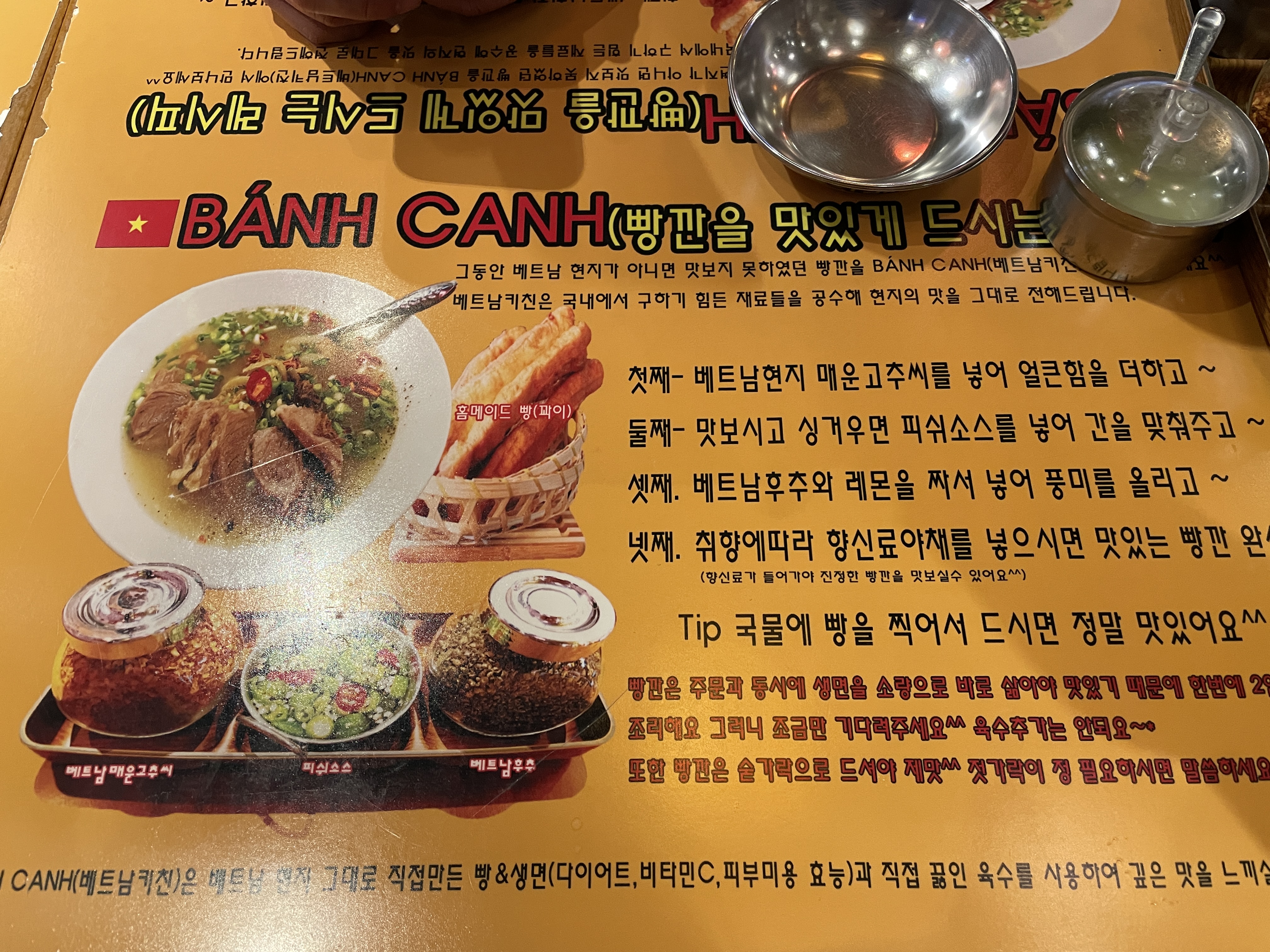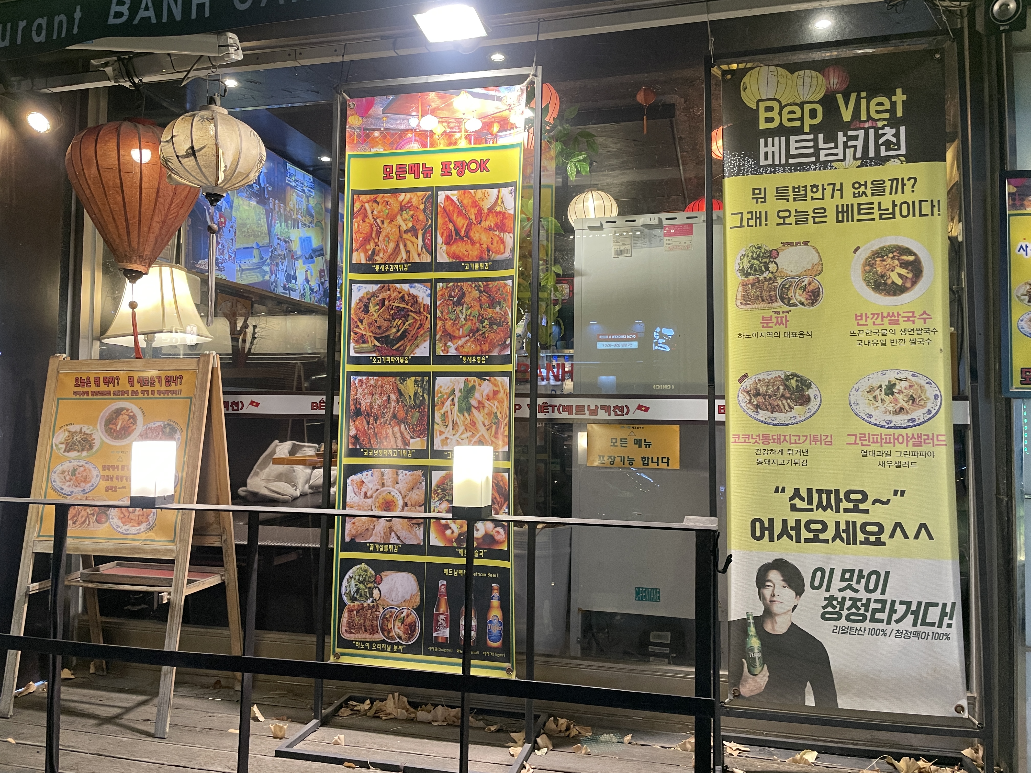 식당 내부는 아늑하고 편안한 분위기로 꾸며져 있어요. 베트남의 전통 소품들이 곳곳에 배치되어 있어 이국적인 느낌을 주고, 친구들과 함께 오기에도 좋은 장소에요. 조명이 따뜻하고, 테이블 간격도 적당해서 대화하기에도 편안했어요.