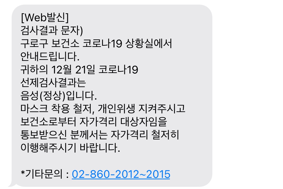검사받고 빠른 곳은 하루 안에 다 나왔지만.. 나는 구로구 보건소로부터 구로구 검사가 폭증하여 결과가 지연된다는 문자를 받았다. ㅋㅋ 중구 쪽은 바로바로 인천은 바로바로 문자로 회신받았다고 하니 참고 !