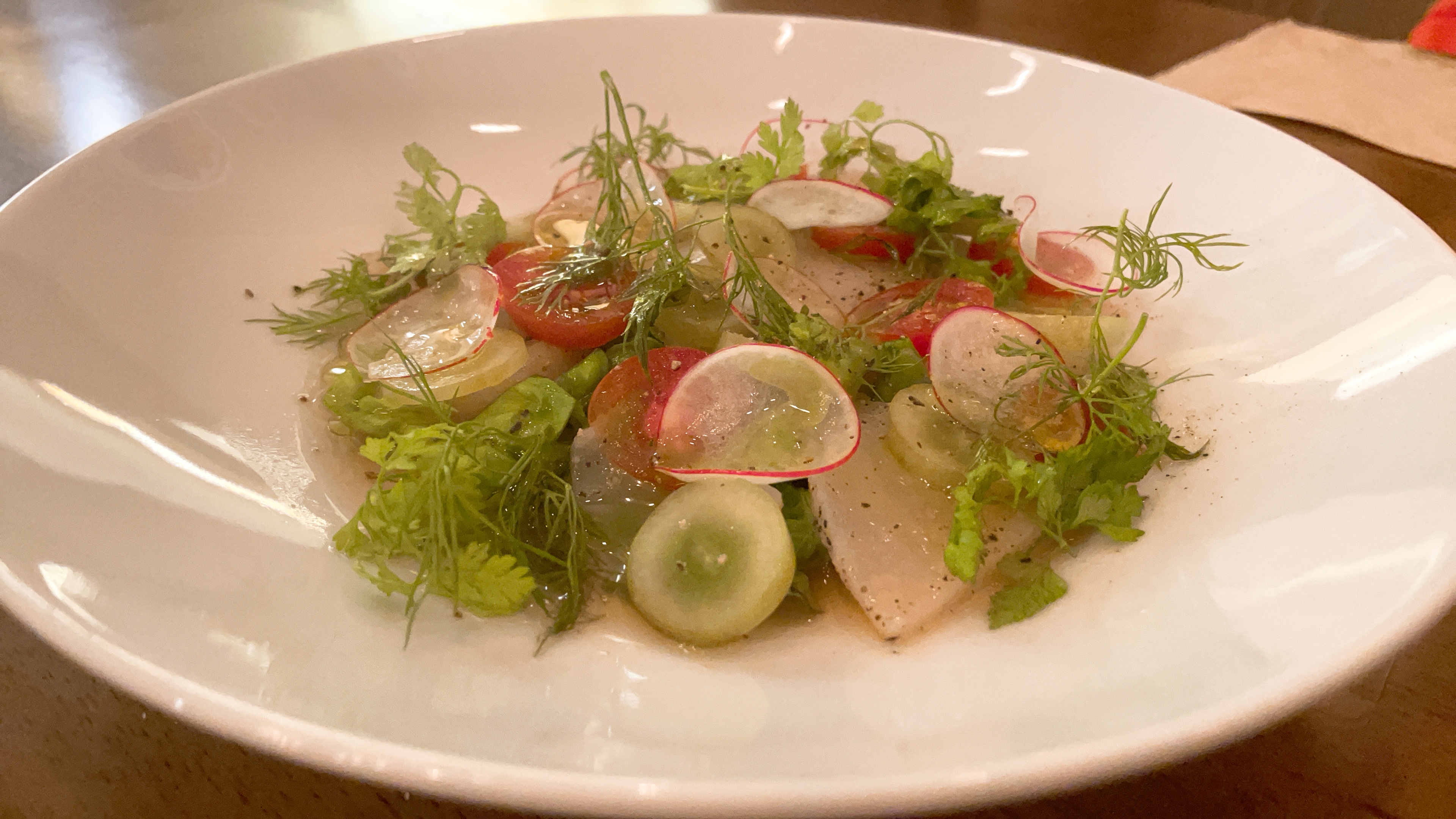 얇게 슬라이스한 생 고기나 생선을 쓰는데, 여기선 관자를 썼다.