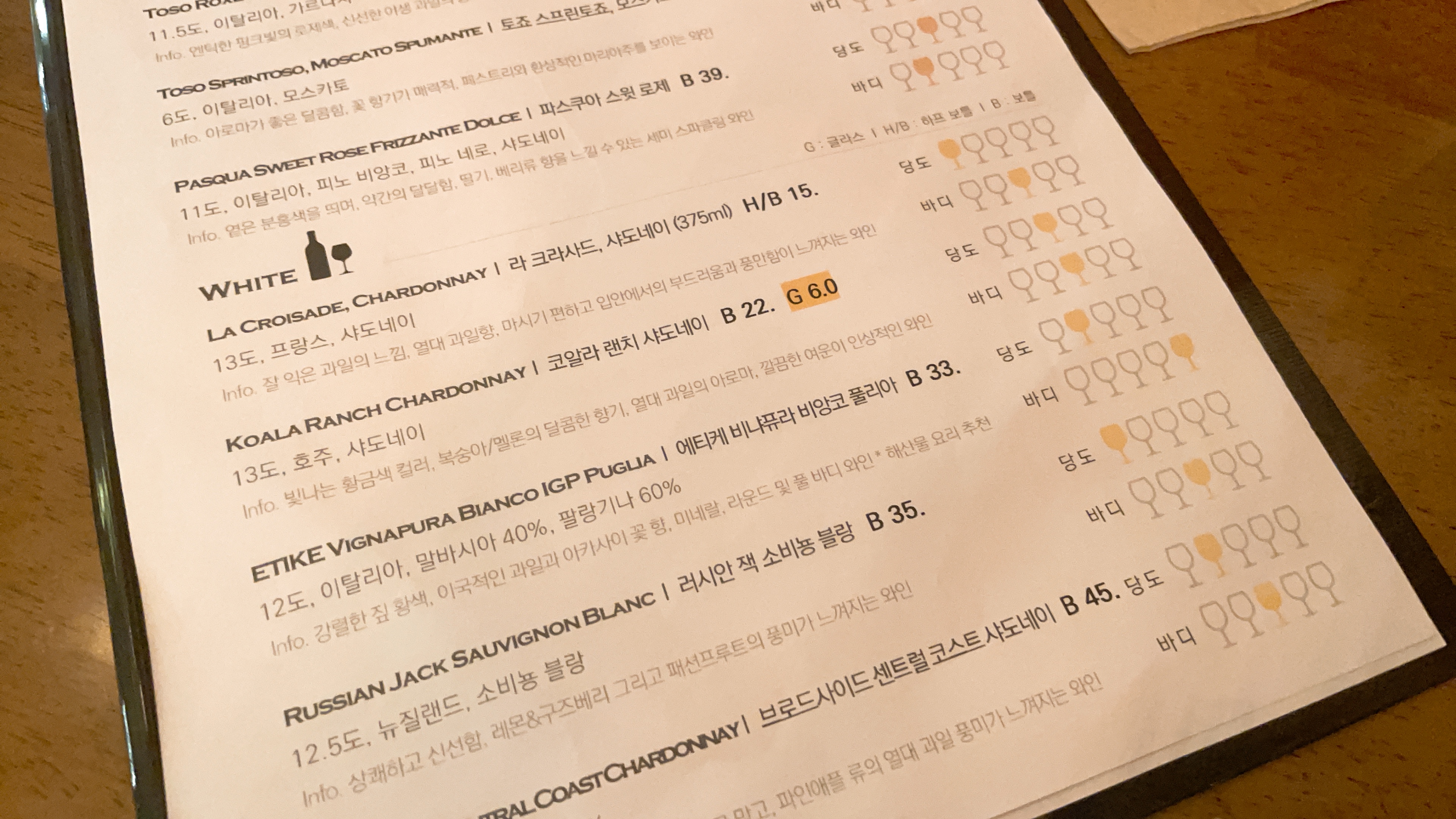 일단 화이트 샤도네이 글래스로 한잔을 시키고,