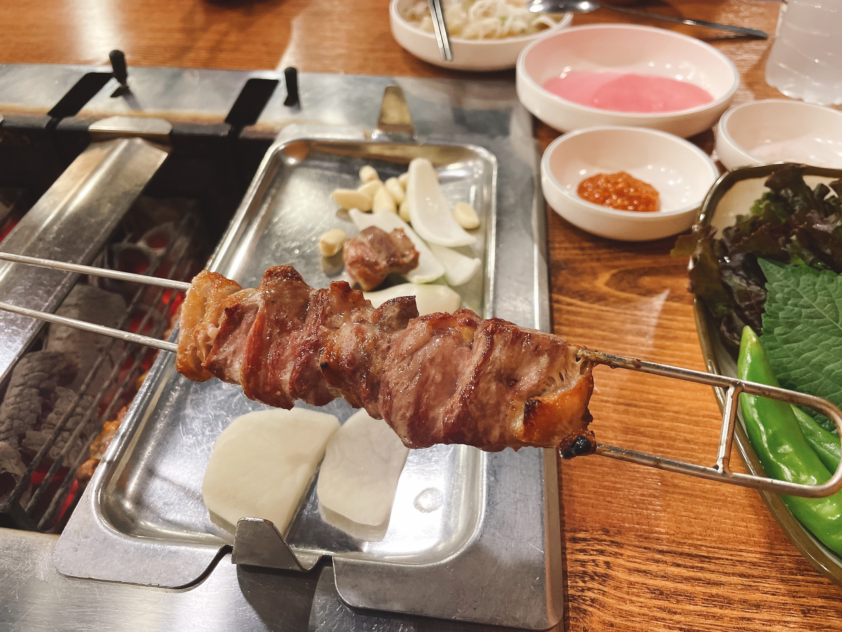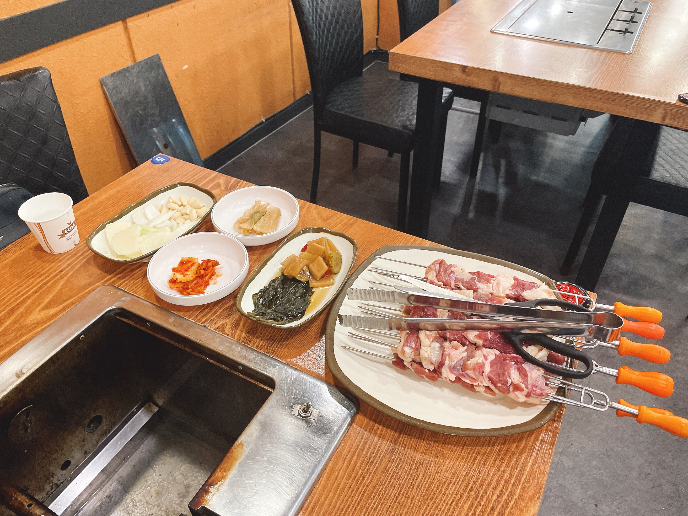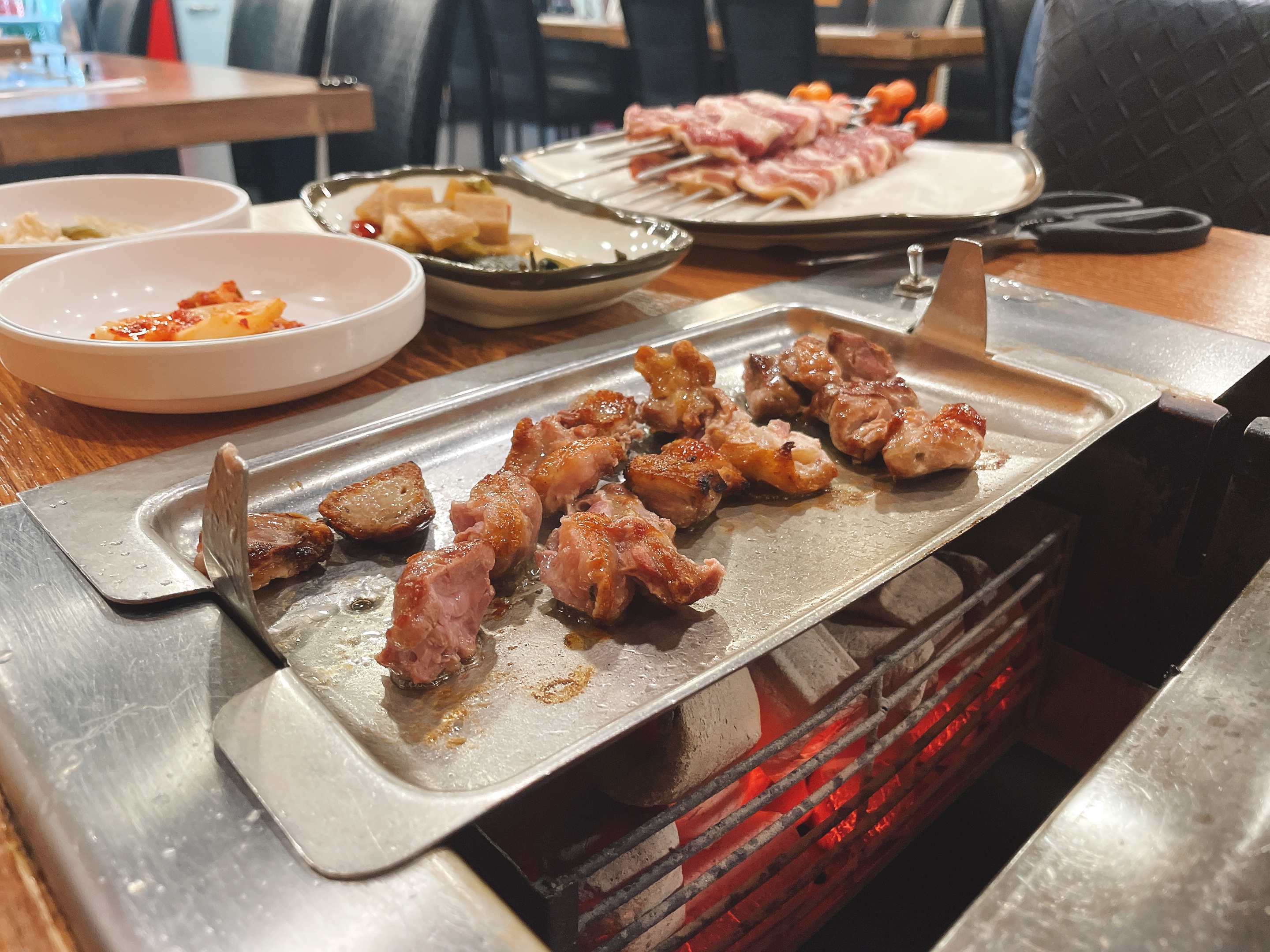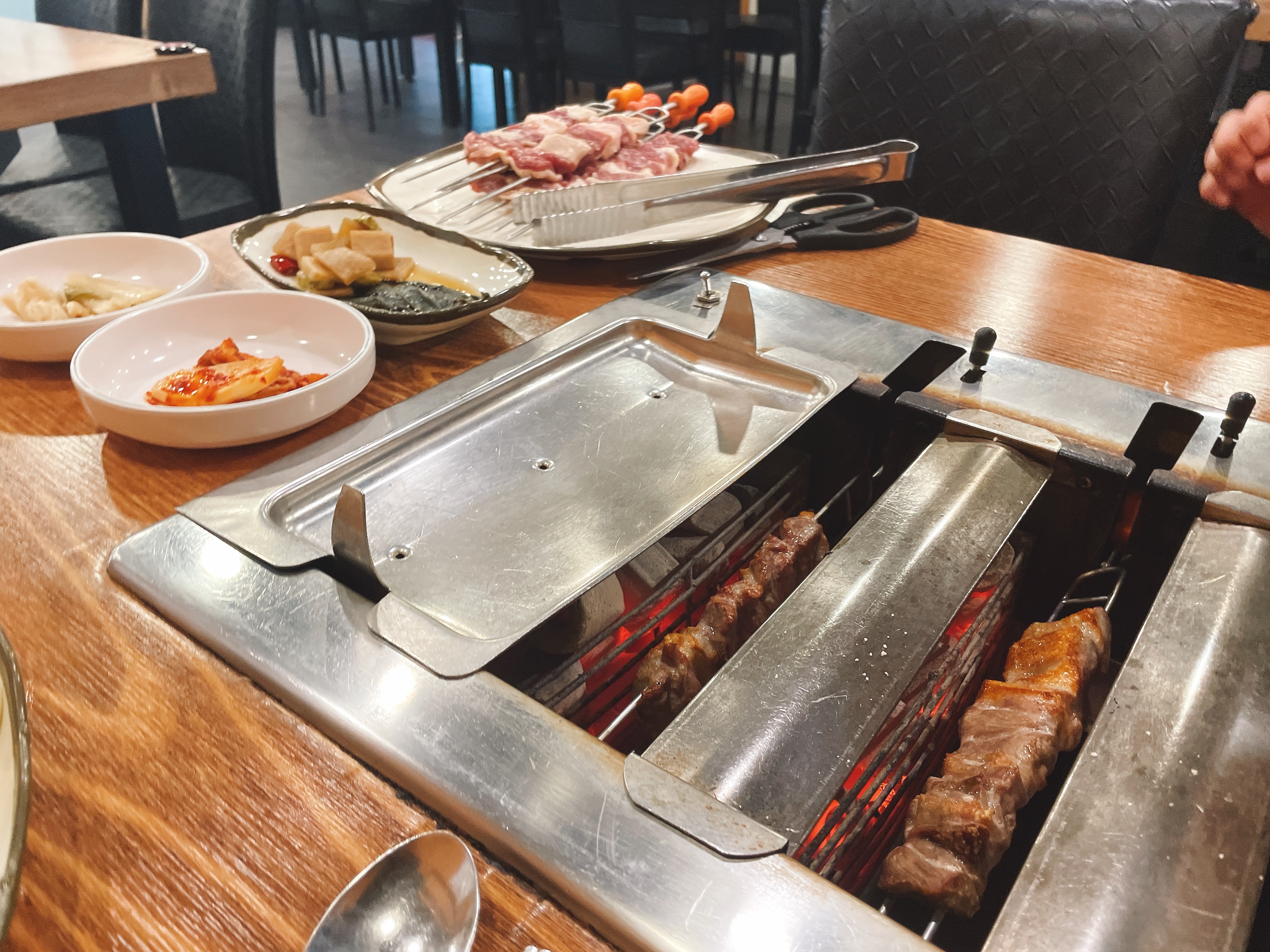 회전오리를 위한 숯불과 구이 툴들이 인상깊다.