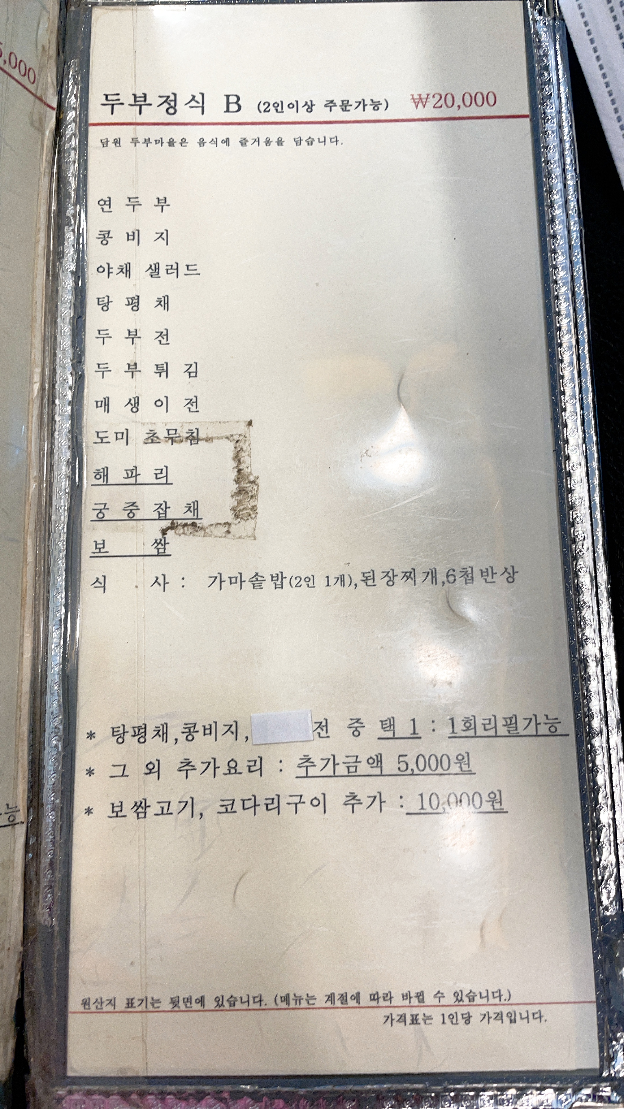 두부정식 코스가 여러개인데 B로 결정!
