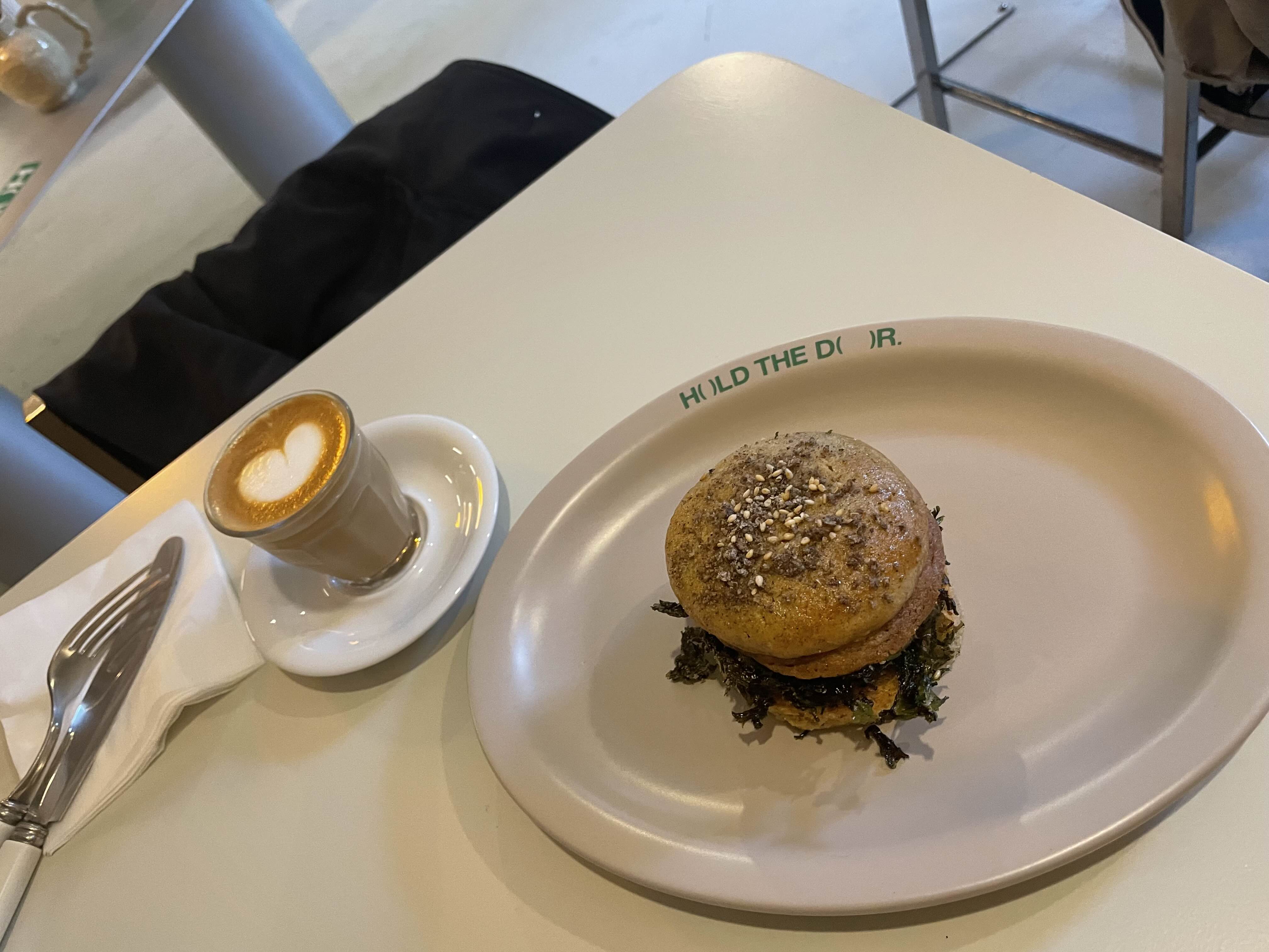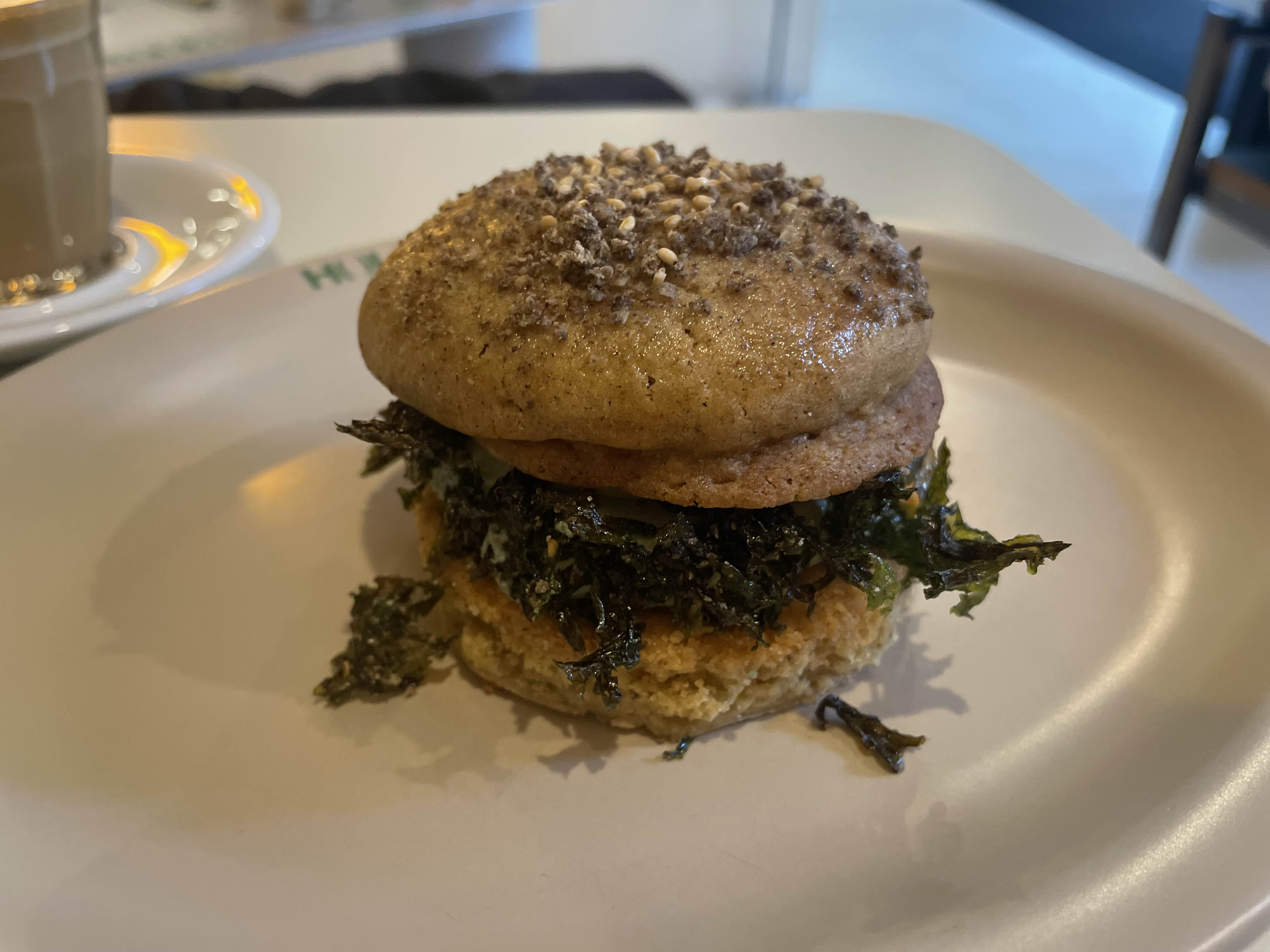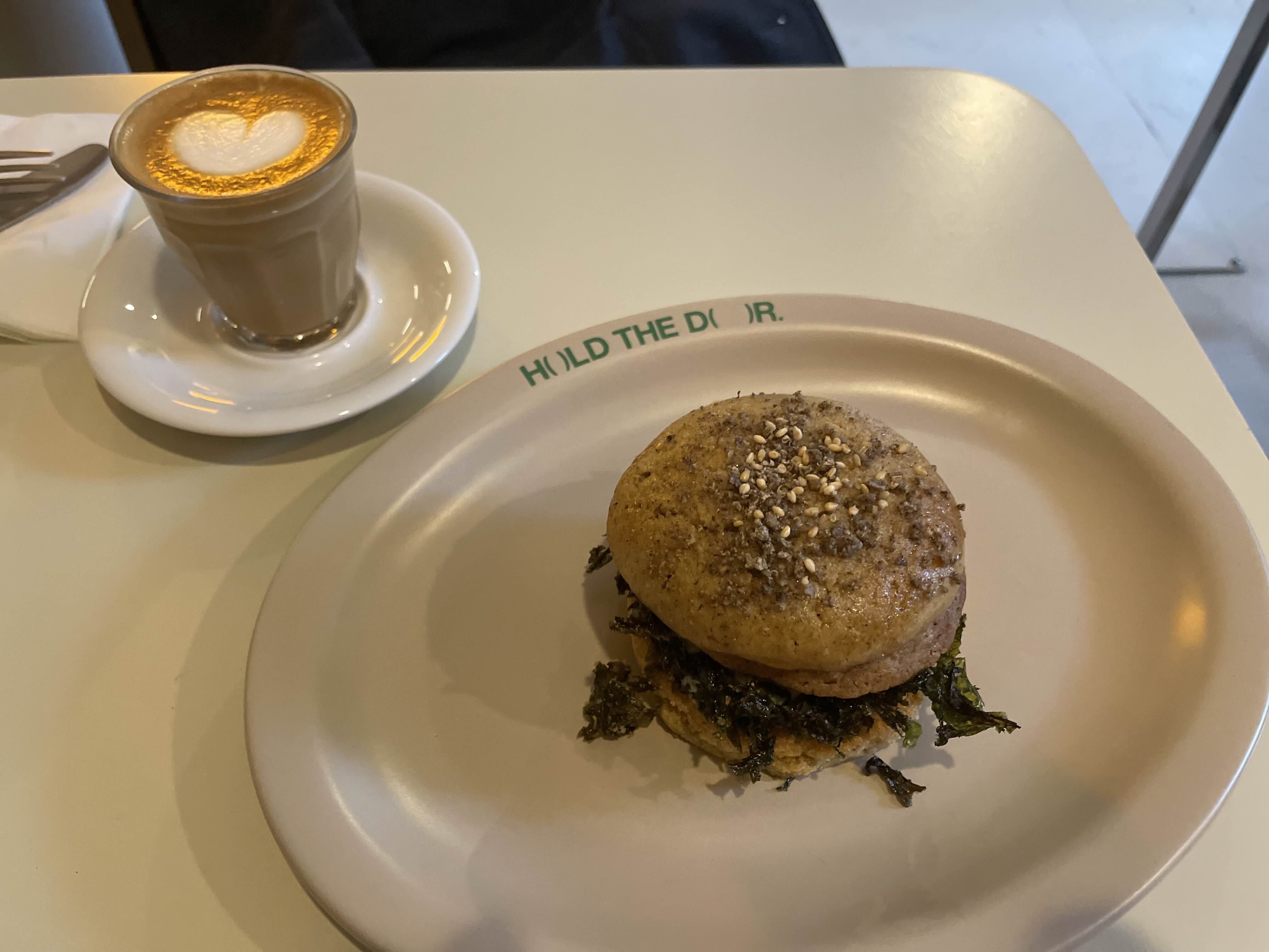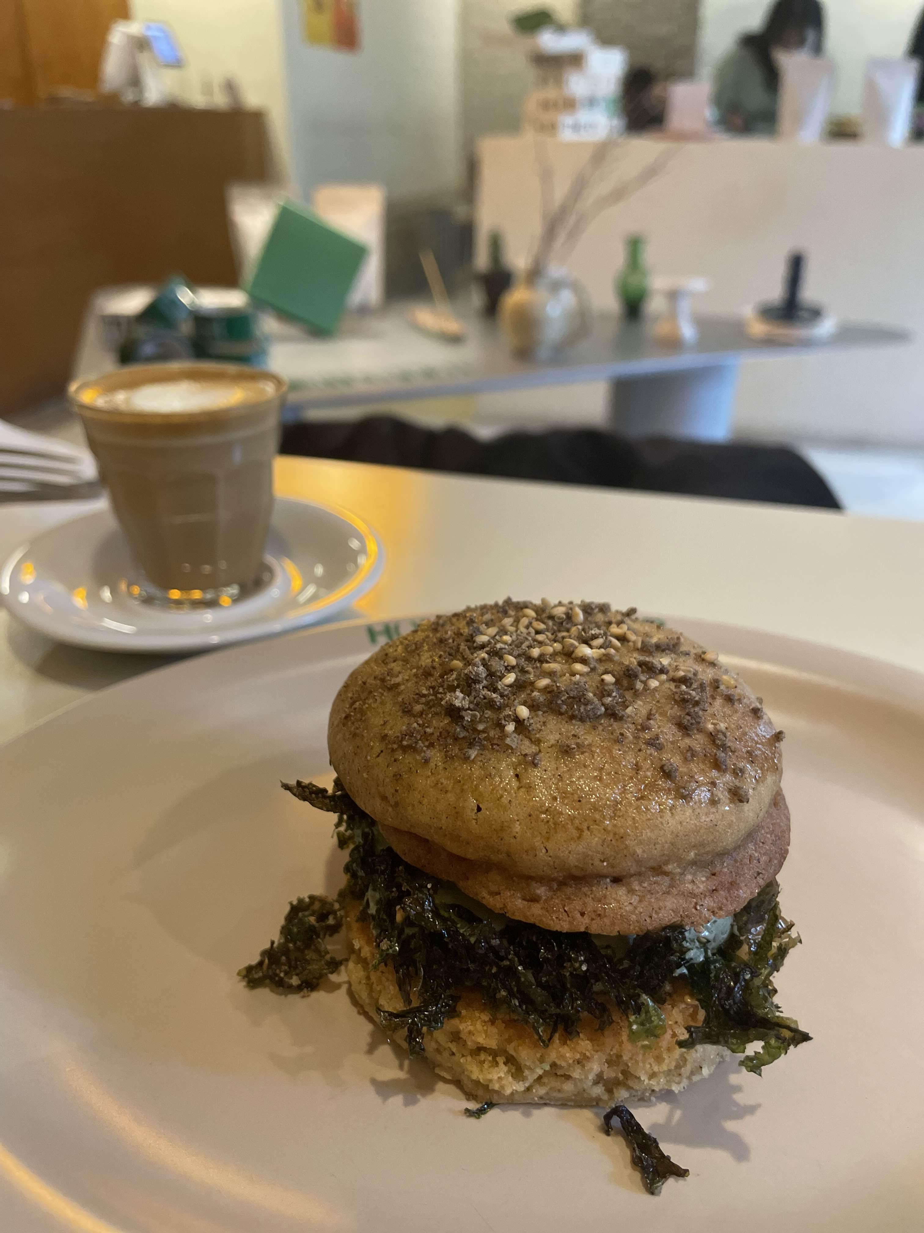 플랫화이트와 참깨랑 김이 들어간 마카롱은