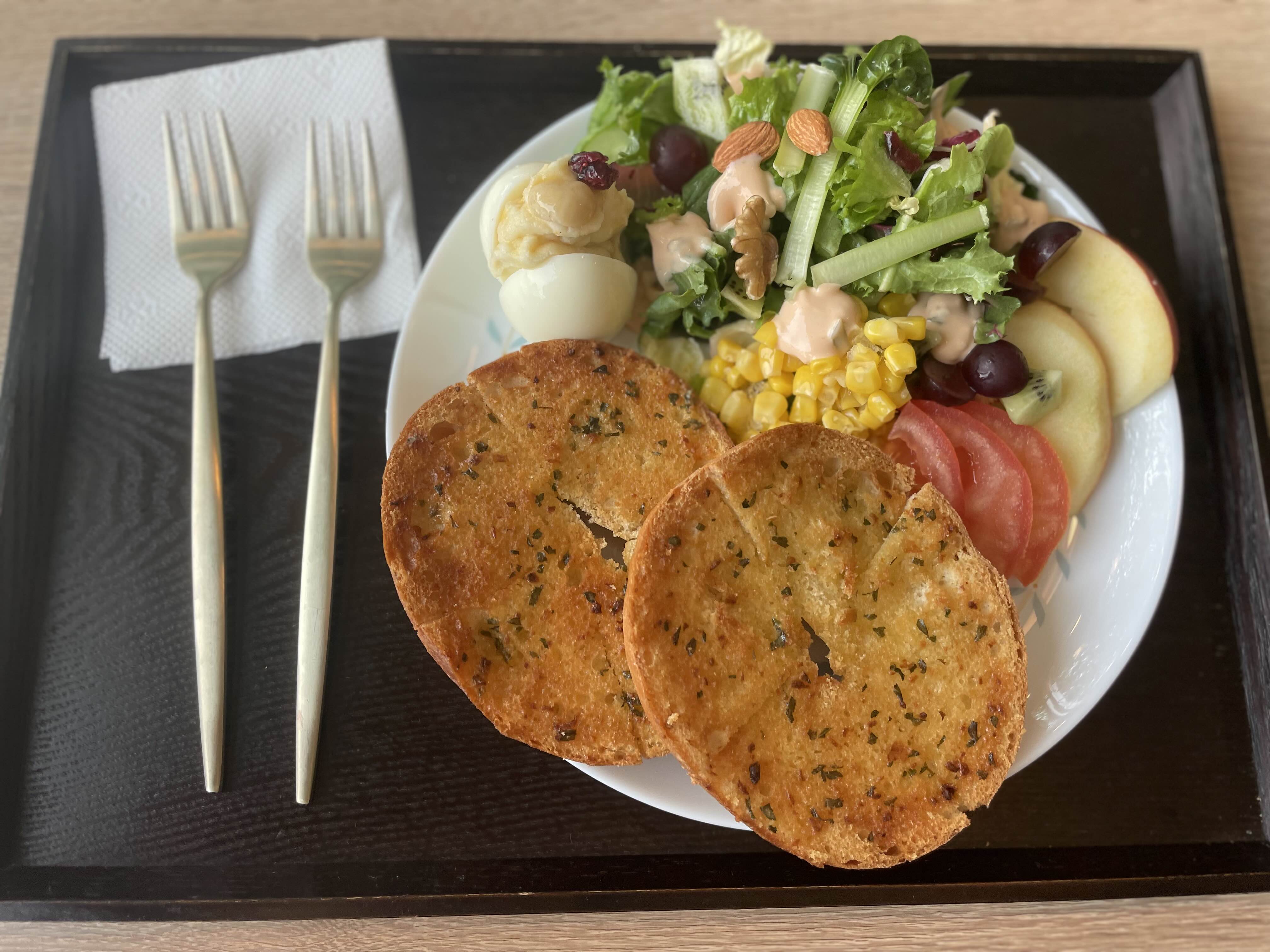 브런치는 이렇게 샐러드 조금에 완숙란, 과일 조금씩 섞어